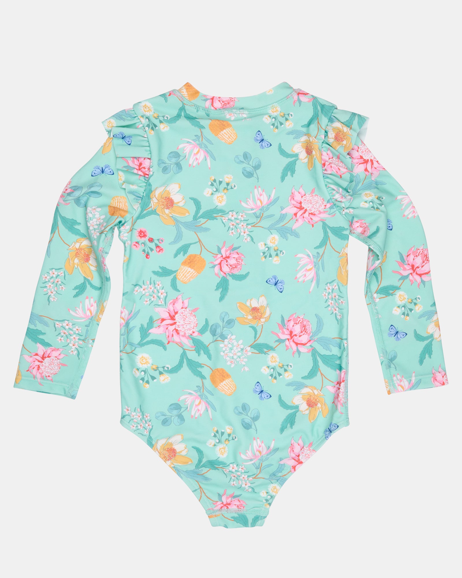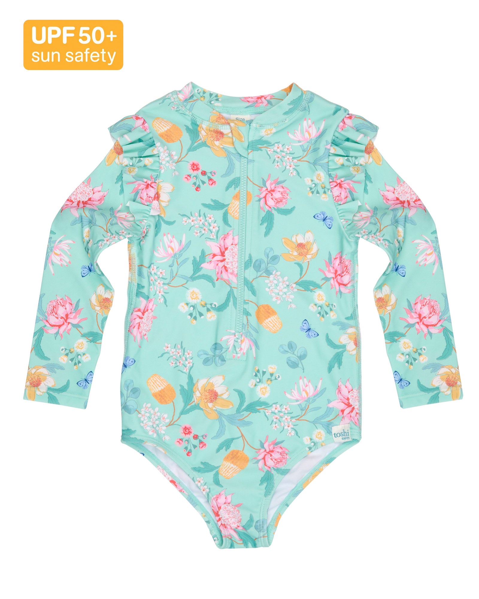 The beauty, functionality and elevated quality for which Toshi is traditionally renowned, is crafted into an exquisite swimwear collection. Rated UPF 50+, Toshi Swim offers maximised sun protection and water safety. The finest quality Nylon fabrication is fast drying, chlorine and salt water friendly. A high neckline and long sleeves ensure greater sun protection. The Toshi Swim Bodysuit features a frill on shoulders for a playful and charming touch. The Swim Bodysuit has a front opening neck zip for ease of dressing. Seamless sides offer greater comfort and enhanced contouring. An original and exclusive Toshi print design is featured.
