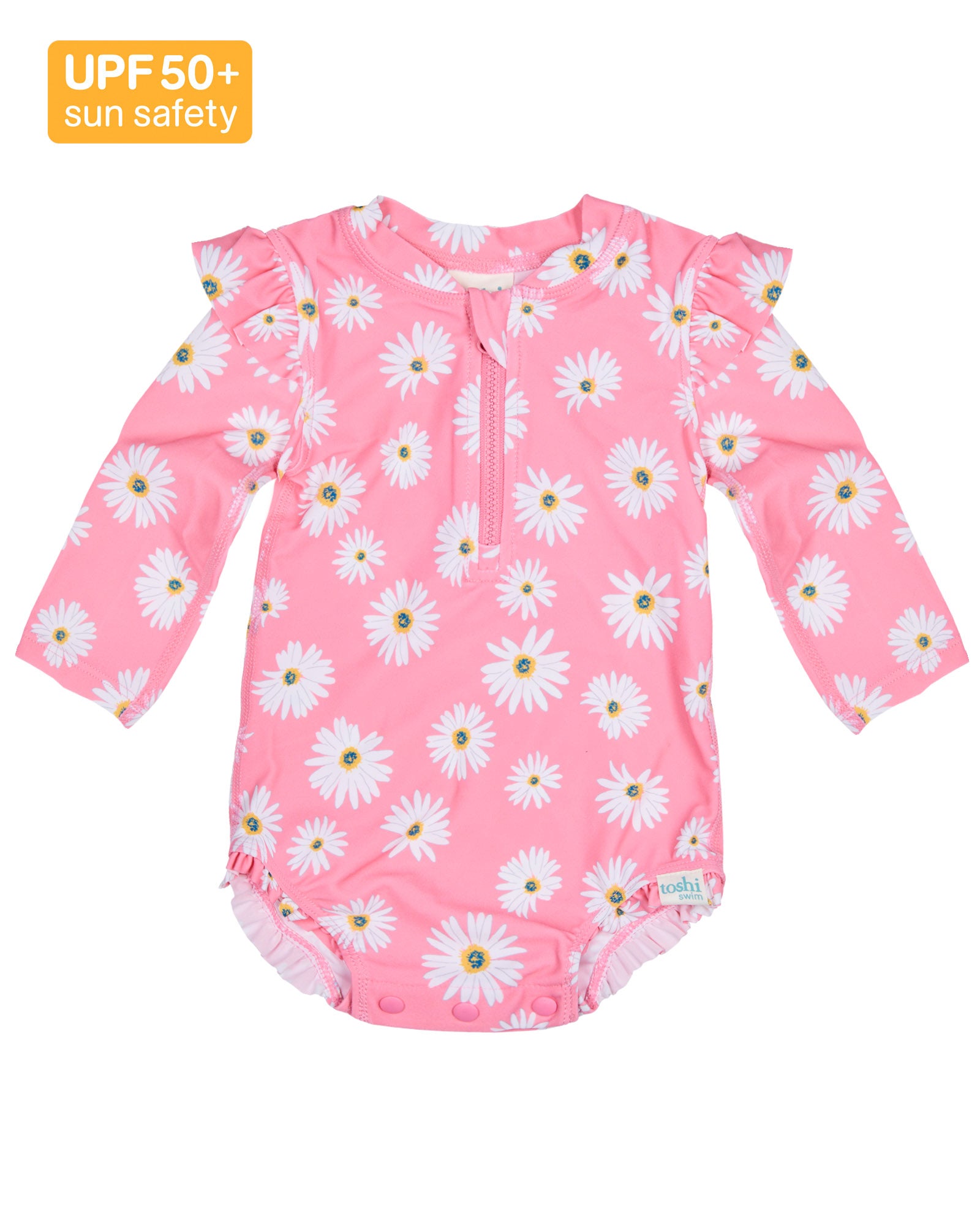 The beauty, functionality and elevated quality for which Toshi is traditionally renowned, is crafted into an exquisite baby swimwear collection. Rated UPF 50+, Toshi Swim offers maximised sun protection and water safety. The finest quality fabrication is fast drying and chlorine & salt water friendly. The adorable Toshi Swim Onesie features a frill on shoulders for a playful and charming touch. A high neckline and long sleeves ensure greater sun protection. Bottom opening press studs facilitate efficient nappy changes. The Swim Onesie has a front opening neck zip for ease of dressing. Seamless sides offer greater comfort and enhanced contouring. An original and exclusive Toshi print design is featured.