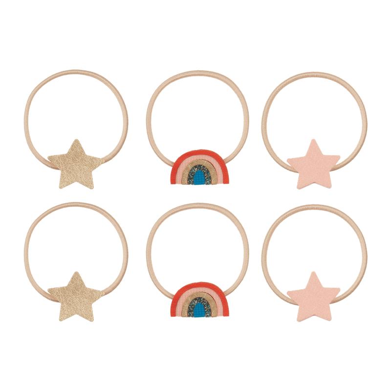 We adore this cheerful retro little pack of ponies! Two rainbows made from intricately cut leatherette in a blast of primary colours attached to neutral elastic plus four leatherette stars in gold and pink!