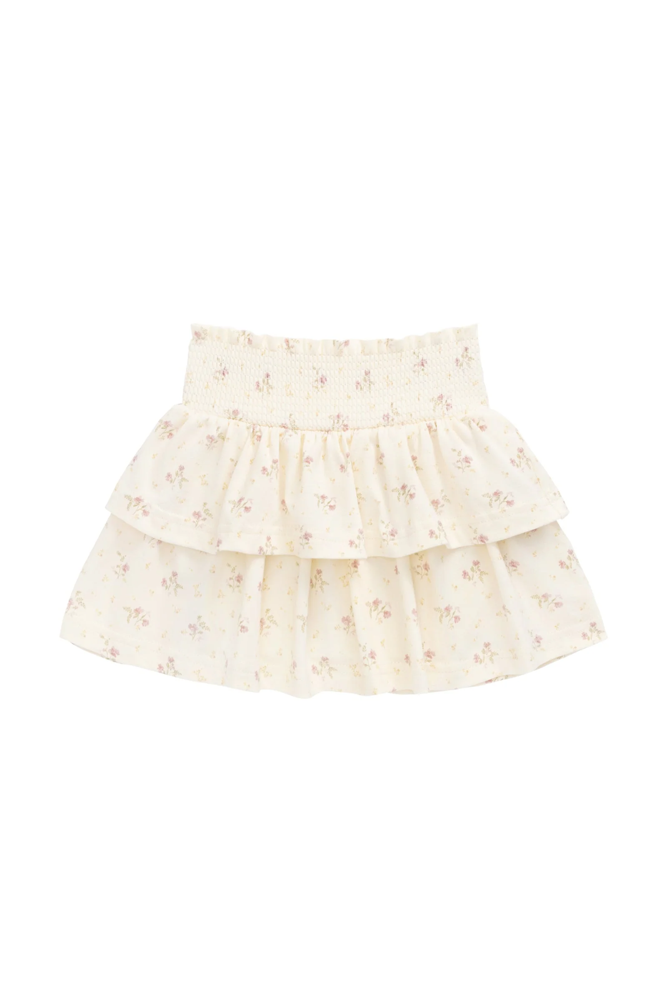 The Organic Cotton Ruby Skirt – Thelma Parchment is a sweet and timeless piece, perfect for twirling through the seasons. Featuring a soft cream base with delicate pink and green floral accents, this skirt includes a smocked waistband and layered ruffles for added charm and comfort.