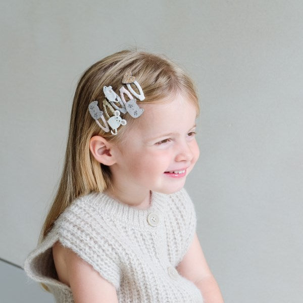 Say hello to our oh-so-cute Cat & mouse mini clips! Two soft little pussycat faces, two sweet little mice and a golden glittering heart - mix and match for all sorts of adorable styles!