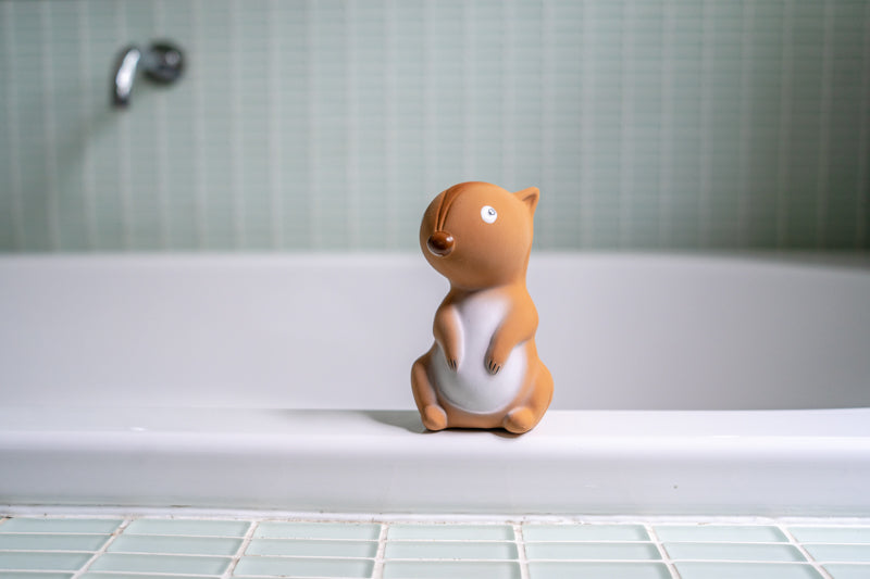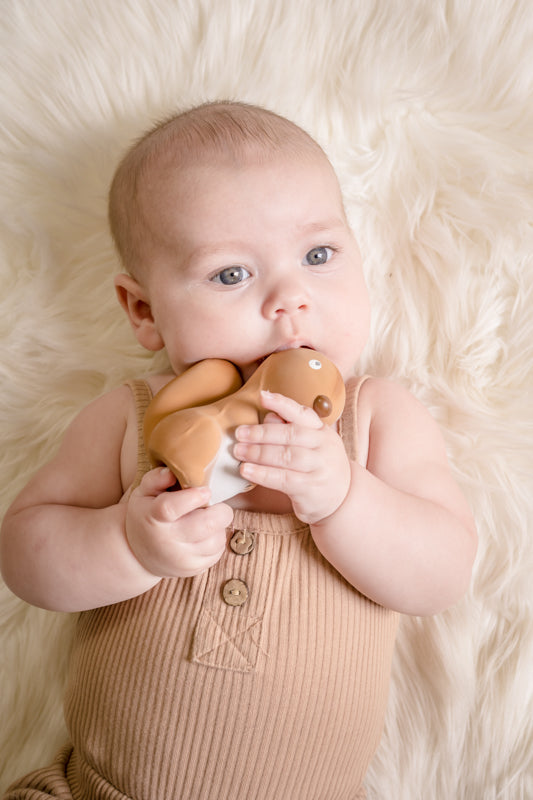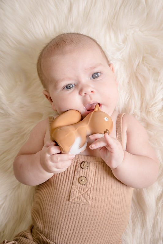 An adorable all rubber squirrel teether that is great for little hands to grab and squeeze. Features a little bell that rattles inside to delight and entertain little ones. This squirrel's little ears are a perfect spot to chew on to relieve sore gums.