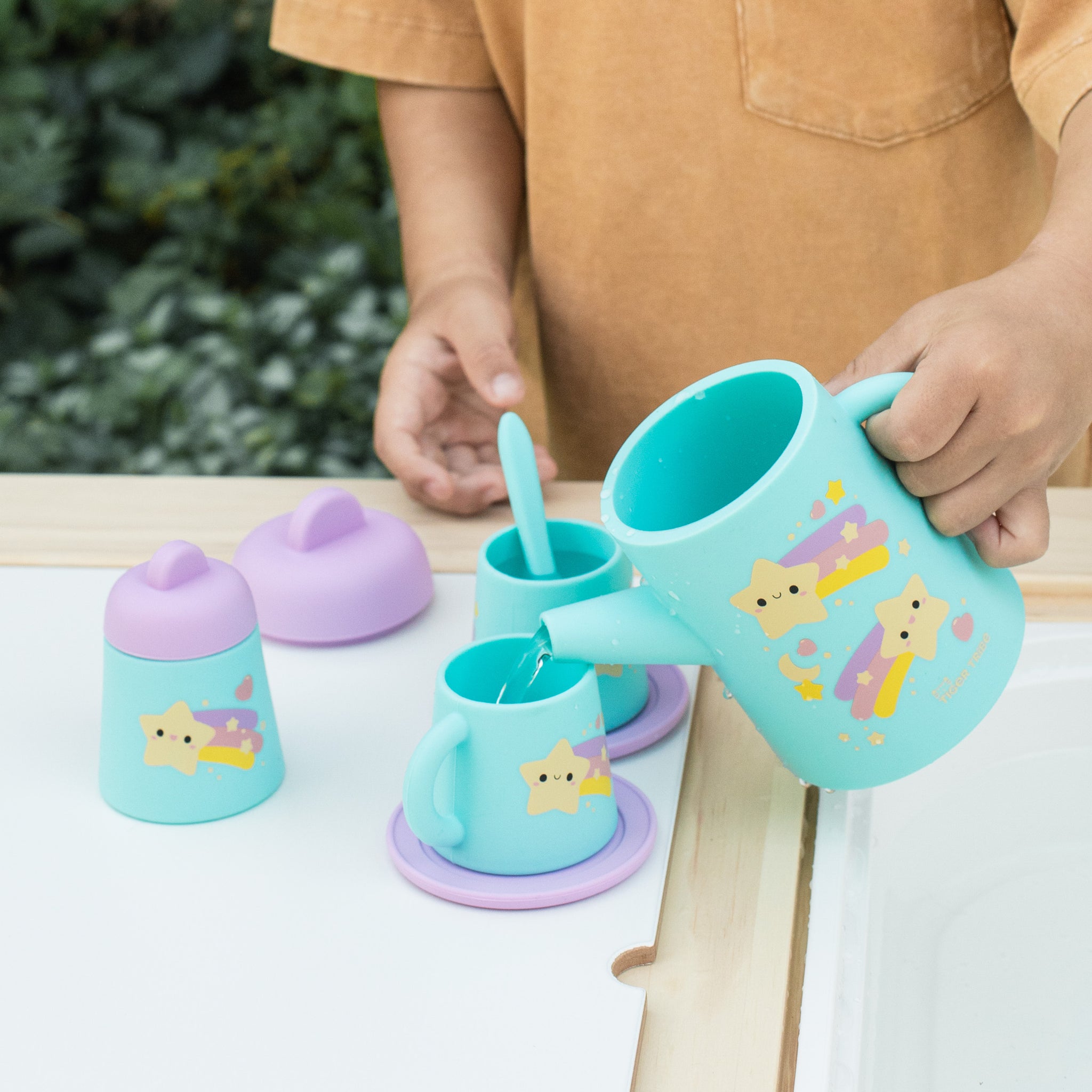 Tea parties just got sweeter with this gorgeous Starlight Party Silicone Tea Set. This versatile, classic tea set is made of kid-friendly, food-grade silicone that’s perfect for playtime. Great for pretend picnics, tea parties, messy sensory play in the outdoor mud kitchen or for creating bubble-chinos in the tub at bath time.